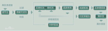 ·第三阶段:2000年以后,新建的渗滤液处理厂一般远离城区,渗滤液没有条件排入城市污水管网以及处理要求的提高,渗滤液仅靠生物处理无法满足要求,一般采取综合预处理+生物处理+深度处理的方法